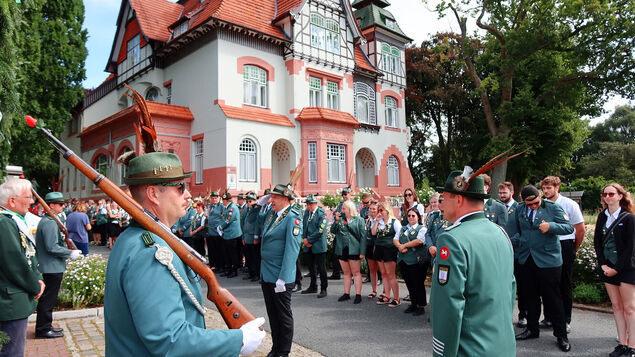 Ergreifend war die feierliche Kranzniederlegung unter den Klängen der "Spielgemeinschaft Turnkreis Cuxhaven/Bremerhaven" sowie der "Küstenmusikanten" am Ehrenmal für die Opfer der Weltkriege. Auch den verstorbenen Schützenkameraden wurde gedacht. "Wir versuchen, das immer sehr gefühlvoll und langsam zu spielen", sagte Küstenmusikant Andree Rywak (56), seit seinem fünften Lebensjahr als Bläser dabei.