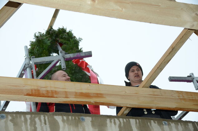 Mitten in Altenbruch erhebt sich der Rohbau der neuen Sparkassenfiliale. Trotz winterlicher Verzögerungen schwebte nun der Richtkranz über dem Gebäude, das für den Standort ein Zeichen der Zukunftsfähigkeit setzen soll.