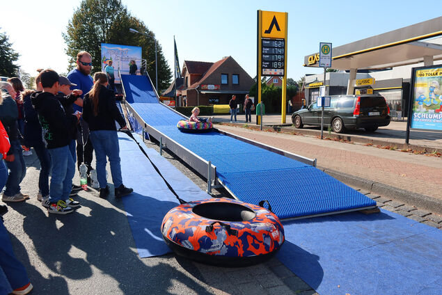 Ein echter Dauerbrenner war die Riesenrutsche, die von morgens bis abends im Dauereinsatz war. Kinder sausten auf Reifen kreischend in die Tiefe, Eltern feuerten an. Wer im Reifen saß, hatte nur eine Wahl: Augen zu und durch.