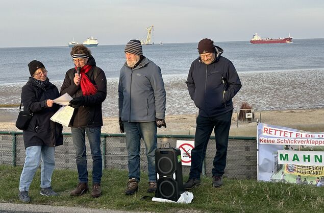 Während am Sonnabendnachmittag vor dem Leitdamm bei Cuxhaven der holländische Schwimmkran "Hebolift 10" wahrscheinlich Munitionsresten in der Elbmündung auf der Spur war, versammelten sich in eisiger Kälte am Jonathan-Zenneck-Denkmal Cuxhavenerinnen und Cuxhavener zu einer Mahnwache. Damit wollen sie zeigen, dass die Proteste gegen die Elbvertiefung in Cuxhaven keineswegs verstummen werden.