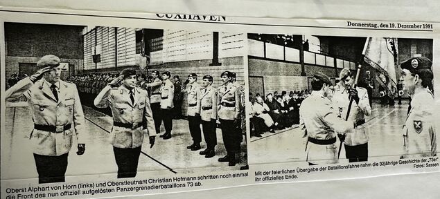 Dann wurden konkrete Pläne bekannt. Im März 1991 begann mit der Auflösung der ersten beiden Kompanien der Abschied auf Raten. Mit einem letzten Bataillonsball in den Hapag-Hallen verabschiedete sich das Panzergrenadierbataillon 73 am 20. September 1991. Vor 470 geladenen Gästen bewachte ein aus einem Eisblock modellierter Bär das Buffet.