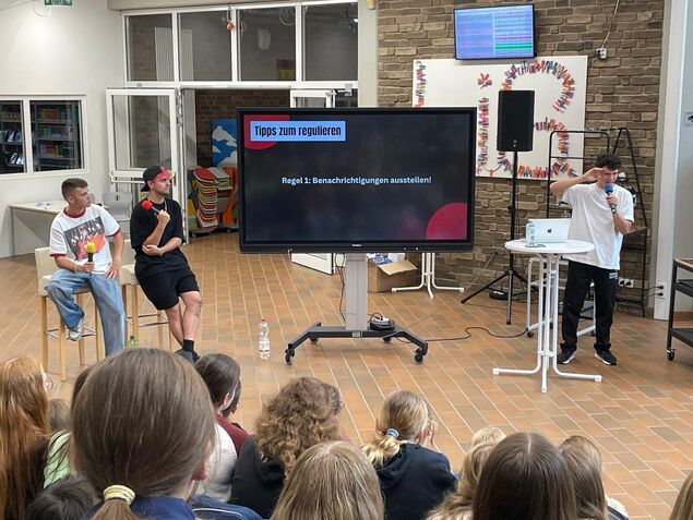 Los ging es mit einem 90-minütigen Vortrag. Statt trockener Fakten gab es viel Humor, Selbstironie und echte Geschichten aus dem Alltag der Influencer. Zwischen Lacher und Pointen schoben die drei aber auch ernste Botschaften: Warum zu viel Handyzeit uns müde macht und welche Chancen und Gefahren KI mit sich bringt. Wer dachte, Social Media sei nur "lustige Katzenvideos", wurde schnell eines Besseren belehrt.