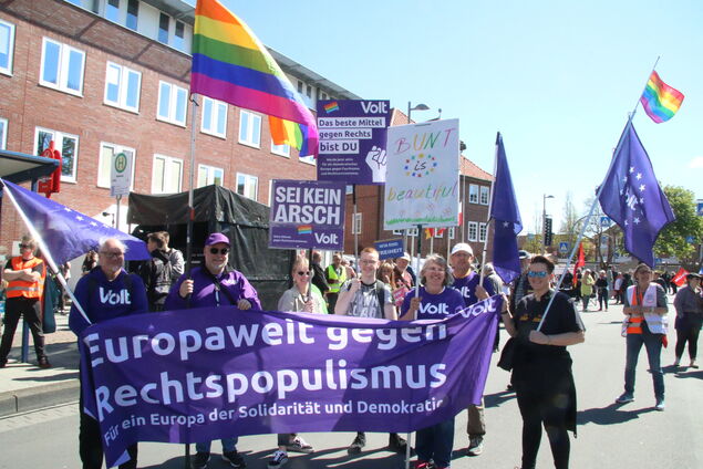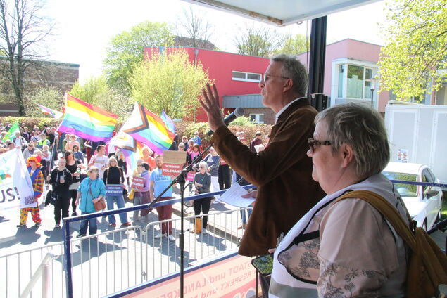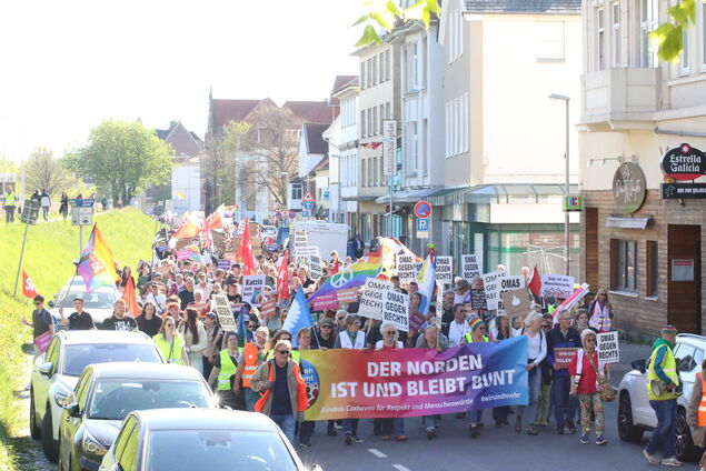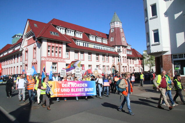 Aus allen Richtungen strömen die Menschen zusammen: mit Fahnen, Transparenten und Plakaten, auf denen Botschaften wie "Wir sind Freiheit", "Wir sind Vielfalt", "Ohne Vielfalt bleiben uns nur Schlager und Rosenkohl" prangen. Rund 1500 Schilder werden verteilt, an einem Stand gleich neben der Bushaltestelle basteln einige noch eigene Botschaften. Die Atmosphäre gleicht einem bunten Sommerfest - doch der Anlass ist ernst.