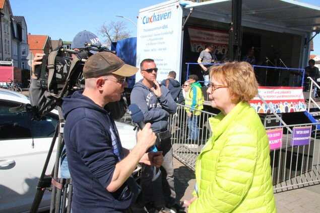 Während auf dem Kaemmererplatz die Initiative "Gemeinsam für Deutschland" (GfD) zum Protest aufgerufen hat, klingt auf schon von Weitem Musik über den Platz vor dem Rathaus. Stimmengewirr, das Rascheln von Fahnen im Wind, Kinderlachen, Seifenblasen - der Rathausplatz in Cuxhaven war am Sonnabend nicht nur Versammlungsort, sondern Symbol: für Freiheit, Vielfalt und demokratische Stärke. Während die Sonne den Platz in warmes Frühlingslicht tauchte, füllten sich gegen 13 Uhr die Straßen rund um das Rathaus.