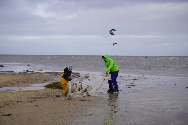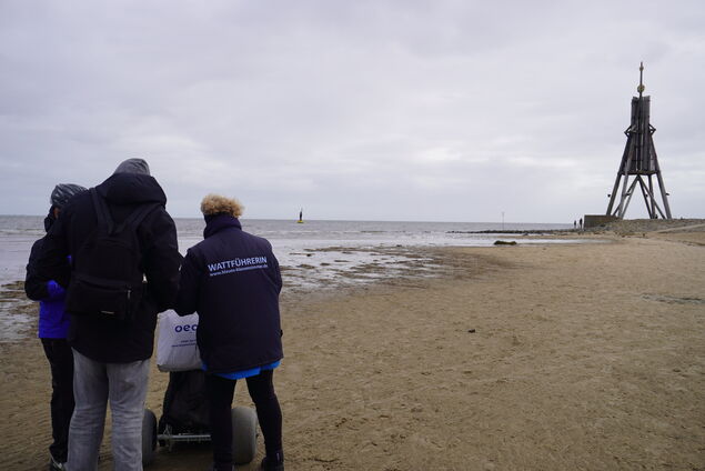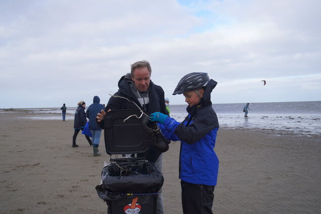 Handschuhe an, Müllgreifer bereit - ab dem Wahrzeichen Kugelbake ziehen Freiwillige los. Sie sammeln Plastik, Netze und Verpackungen und entsorgen das gesammelte "Strandschlecht" fachgerecht. Die "Clean up Aktion" des blauen Klassenzimmers dauert rund 90 Minuten, führt Richtung Strandhaus Döse und soll nicht nur den Strand säubern, sondern auch Bewusstsein für die Nordsee schaffen. Frauke Kruggel, Diplom-Pädagogin, erklärt den anwesenden Freiwilligen, darunter auch Kinder, worauf beim Müllsammeln zu achten ist.