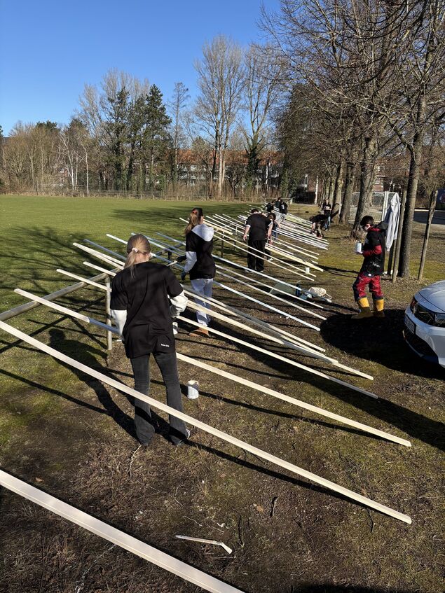 Wie der Bauwagen einmal aussehen soll, vor allem auch innen, entschieden die Jugendlichen. Entwürfe wurden auf Karo-Papier gezeichnet. Blickfang sollen die regenbogenfarbige Decke und das AAG-Logo als Neonlicht werden. Angesichts der Größe des Anhängers ist kaum vorstellbar, dass dort 54 Balken überhaupt Platz finden sollen, aber genau so ist es geplant. Die Balken strichen die Jugendlichen auf dem Schulgelände im Freien.