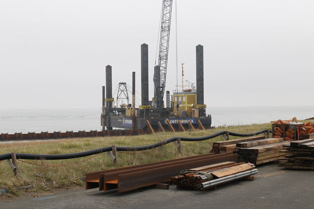 "Die Schrägpfähle sind das, was beim Rammen so laut ist", kam Kokkelink auf die Schallemission zurück. Was diese Pfähle betrifft, klafft derzeit nur noch eine Lücke von 400 Metern, die gefüllt werden will. Positiv ist aus NPorts Sicht auch, dass zwischen den Vertikalpfählen eingepasste Bleche bisher keine Probleme verursachten. "Glücklicherweise gab es bislang überhaupt keine Schlosssprengungen", so Alexandra Brandt.