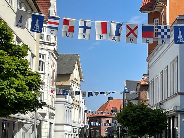 Cuxhavens Innenstadt erstrahlt in maritimer Pracht mit neuen Wimpelketten. Doch kleine Schönheitsfehler trüben das Bild. Aktuell sorgen die Ketten bei Passanten eher für Verwirrung. Bis zur offiziellen Präsentation soll alles perfekt sein.