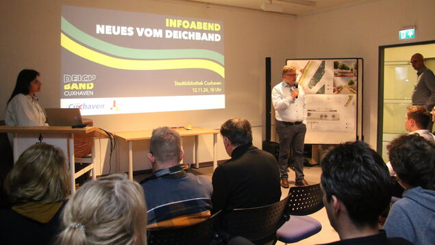 Die Stimmung im bis auf den letzten Platz gefüllten Saal der Stadtbibliothek war optimistisch und gespannt. In roten Lettern verkündete ein Schild "Saal belegt!" - ein deutliches Zeichen für das große Interesse der Cuxhavener am "Deichband"-Projekt.