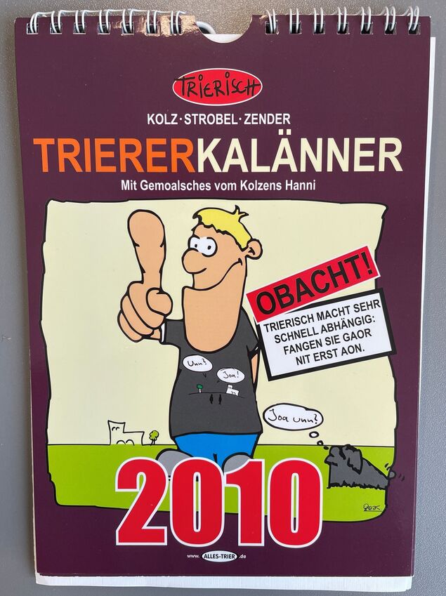 Herrlich! Dazu gab es einen Kalender mit lustigen Karikaturen, der bereits auf dem Titel warnte: "Obacht! Trierisch macht sehr schnell abhängig: Fangen Sie gaor nit erst aon." Diese Einsendung war wirklich die Kirsche auf der Sahne! Und wurde natürlich beim Umzug auch nicht entsorgt.