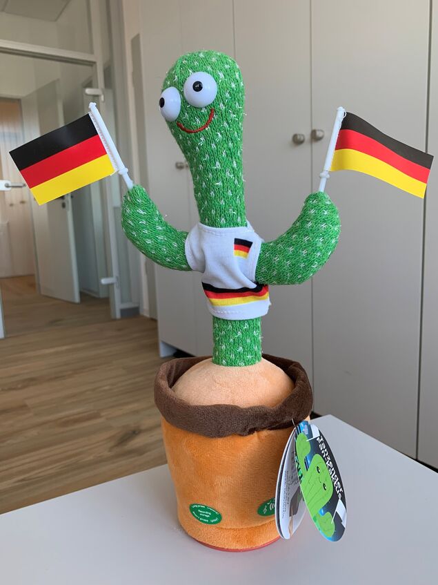 Joscha Kuczorra: Gerade einmal eineinhalb Jahre ist das Stoff-Teil alt, das Batterien in sich trägt. Und doch hatte ich schon wieder verdrängt, dass ich es besitze. Im Juni 2024 überraschte mich eine Kollegin, als sie mir kurz vor dem Start der Fußball-Europameisterschaft ein Fan-Utensil schenkte. "Tanzender Fan-Kaktus" nennt der Hersteller das grüne "Etwas". Der Kaktus, dem zwei Deutschland-Fahnen aus den "Armen" ragen, trägt ein weißes Shirt mit schwarz-rot-goldener Flagge. Doch er sieht nicht nur toll aus, sondern besitzt auch noch mehrere Fähigkeiten: tanzen, blinken, Fangesänge abspielen. Und das Beste: Die batteriebetriebene "Pflanze" hat auch noch eine Wiedergabe-Funktion, womit sich auch eigene geistreiche Beiträge aufnehmen und abspielen lassen.
