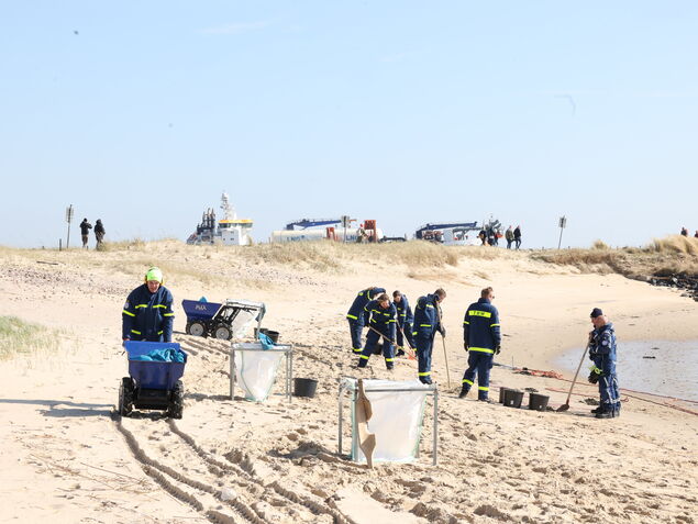 Vor allem der Umgang mit Geräten zur Strandreinigung stand im Vordergrund. Nach Erkundung der betroffenen Flächen und einer umfassenden Lagebesprechung vor Ort waren die rund 60 Einsatzkräfte und Beobachter im Anschluss vor allem damit beschäftigt, das simulierte Öl-Wasser-Gemisch und Öl-Sand-Gemisch aufzunehmen und in schnell aufgebauten Behältern zwischenzulagern.