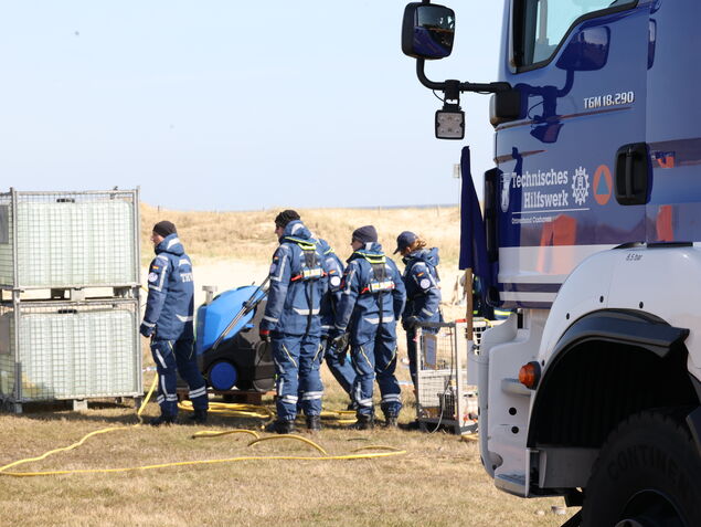 Zum Entfernen des Öls kamen unter anderem sogenannte Skimmer zum Einsatz - Spezialgeräte zur Aufnahme von Öl, das größtenteils auf dem Wasser schwimmt. Die Helfer legten außerdem Ölsperren aus, die dafür sorgen, dass das Öl an Ort und Stelle bleibt und nicht weitertreibt. Parallel zur Strandreinigungsübung führte die Einsatzleitung zudem eine drohnengestützte Erkundungsübung mit Drohnengruppen verschiedener Hilfsorganisationen durch. Regelmäßige Übungen und Schulungen unter Realbedingungen sind wichtig, damit das Spezialgerät auch fachgerecht und möglichst effizient genutzt werden kann.
