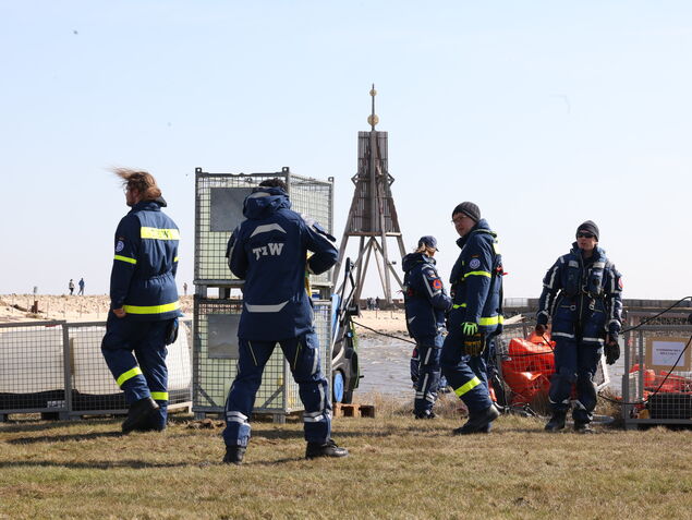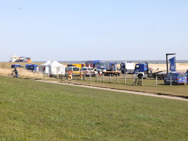 Neben der groß angelegten DLRG-Übung probten am Sonnabend auch THW sowie die Facheinheit Information und Kommunikation der Stadt Cuxhaven gemeinsam mit dem Havariekommando und dem Niedersächsischen Landesbetrieb für Wasserwirtschaft, Küsten- und Naturschutz (NLWKN). Bei der ganztägigen Übung im Bauhafen an der Kugelbake kam zu Land, zu Wasser und in der Luft jede Menge Spezialgerät zum Einsatz.