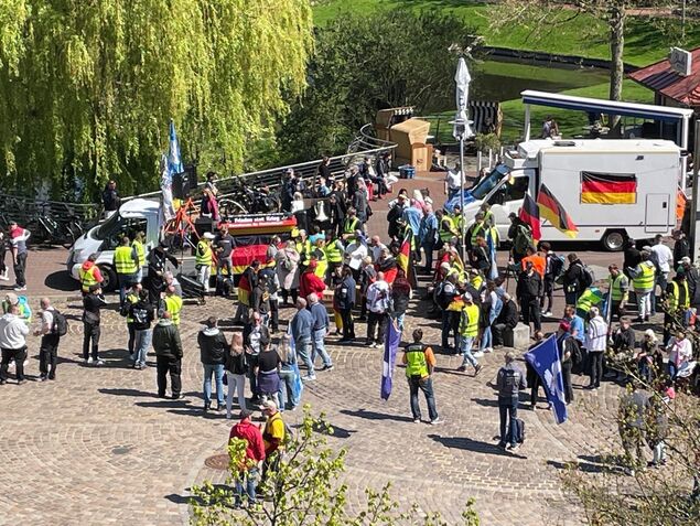 12.30 Uhr: Offiziell startet die Demo der Initiative "Gemeinsam für Deutschland" auf dem Kaemmererplatz um 14 Uhr. Ab 13 Uhr ist das Ankommen geplant. Rund 20 Personen - einige in gelben Westen und mit Deutschlandfahnen - sitzen bereits auf der Terrasse eines Cafés. Die Polizei ist in der Stadt präsent.