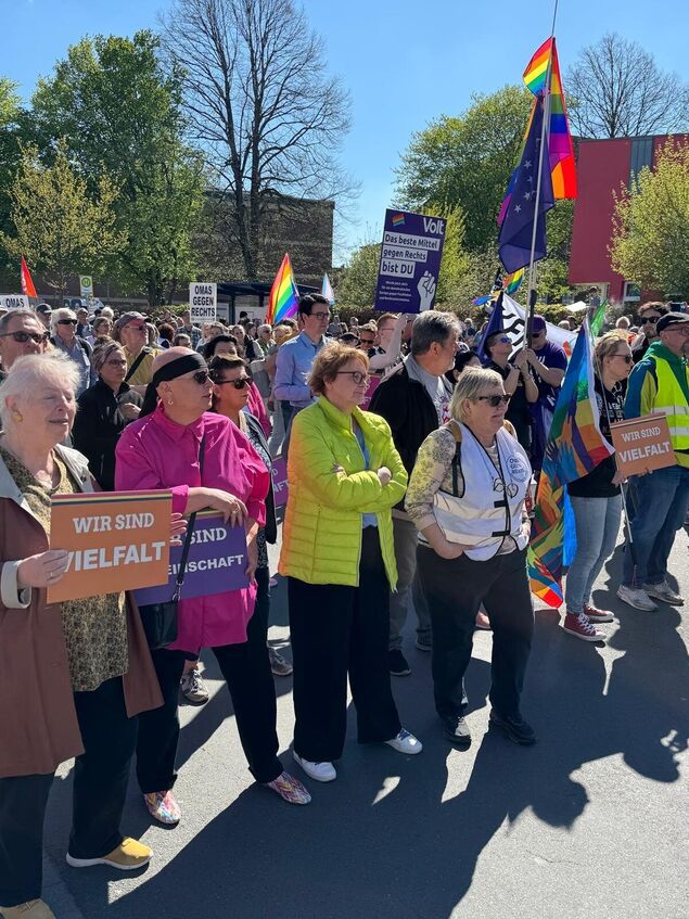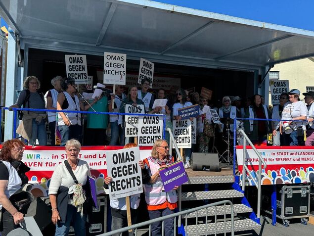 15.15 Uhr: Die "Omas gegen Rechts" singen auf der großen Bühne vor dem Cuxhavener Rathaus. Einige der Omas kommen von einer Kundgebung in Bremerhaven. Weitere sollen folgen, um an dem bevorstehenden Umzug durch die Stadt teilzunehmen.
