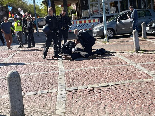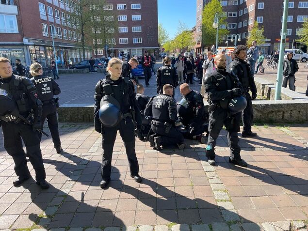 15.55 Uhr: Eine Gruppe von rund acht Gegendemonstranten wartet am Delftweg, wird aber von der Polizei abgeriegelt.15.45 Uhr: Der GfD-Demonstrationszug setzt sich mit lauter Musik vom Wochenmarktparkplatz in Bewegung. Es geht zum Ritzebütteler Marktplatz. Ein Hubschrauber kreist über der Demo.