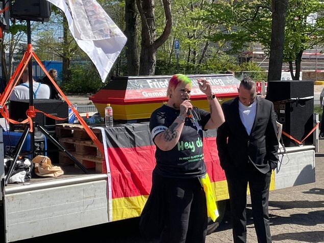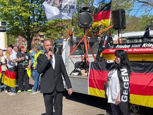 15.25 Uhr: Die GfD-Demonstranten singen die Nationalhymne - und skandieren anschließend "Nazis raus".15.25 Uhr: Am Wochenmarktparkplatz gibt es zur GfD-Demo einen Gegenprotest von zwei Jungs aus Bremen und Bremerhaven und einer Frau mit Transparent.15.20 Uhr: Der Fahrzeugkorso ist auf dem Wochenmarktparkplatz angekommen und hat sich der GfD-Versammlung angeschlossen. Ab jetzt geht es gemeinsam weiter.
