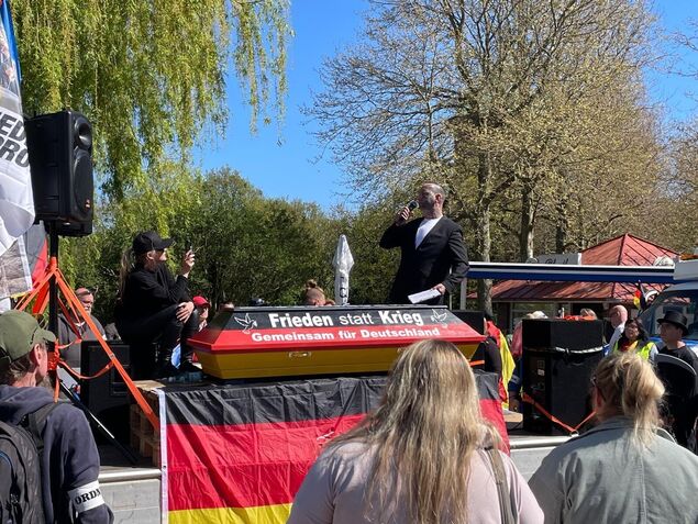 13.10 Uhr: Ein schwarz-rot-goldener Sarg wird auf dem Kaemmererplatz gebracht - auf ihm steht Frieden statt Krieg - Gemeinsam für Deutschland".