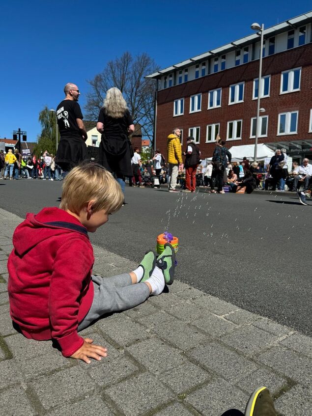 Der kleine Taavi hat seine Seifenblasen-Maschine mitgebracht. Die bunten Seifenblasen erfreuen einige der Teilnehmer. Foto: Potschka