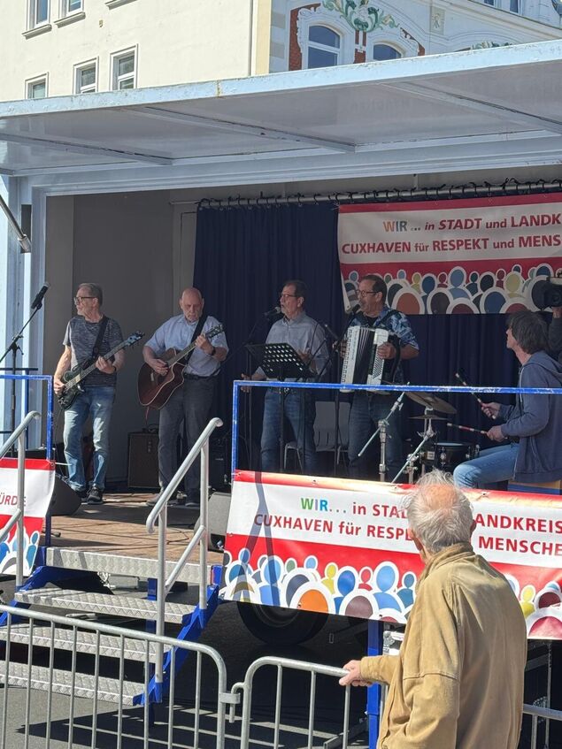 Udo Brozio und vier seiner Männer vom Shanty-Chor Cuxhaven singen live auf dem Rathausplatz bei der Kundgebung. Foto: Potschka