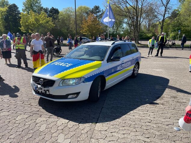 Dieses Auto ist dazugekommen zur GfD-Demo. Jetzt wird überprüft, ob es am Demozug teilnehmen darf, weil es vorher nicht angemeldet worden war. Foto: Lütt
