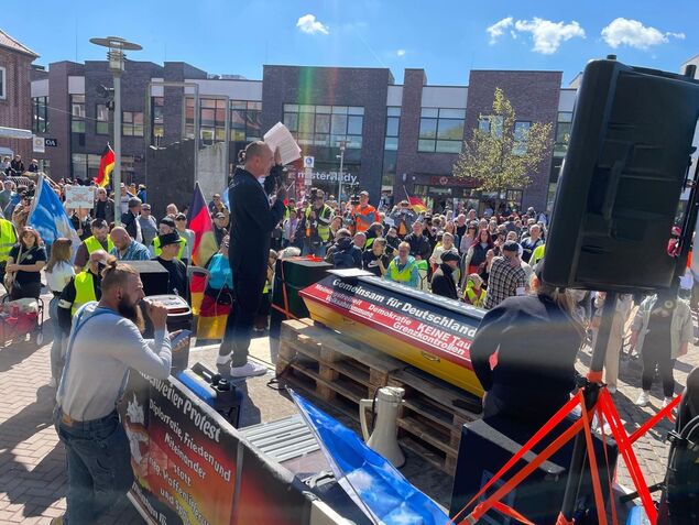 Der Organisator des Cuxhavener Protestes der Initiative "Gemeinsam für Deutschland" spricht zu den Teilnehmern auf dem Kaemmererplatz. Foto: Lütt