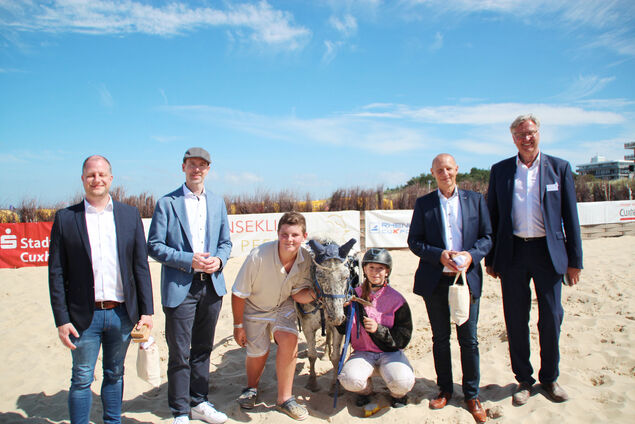 Rennen - Galopper, Distanz 1.400 Meter (Ehrenpreis und 6.000 Euro); Wanderpokal des Niedersächsischen Ministerpräsidenten (Idee-Kaffee-Preis 2025 - Preis der Cuxhaven-Niederelbe Verlagsgesellschaft mbH & Co KG) (v.l.n.r): Cuxhavens Oberbürgermeister Uwe Santjer, Niedersächsische Innenministerin Daniela Behrens, Wattrenn-Geschäftsführer Markus Sellmer, Janine Puschmann (Cuxhaven-Niederelbe Verlagsgesellschaft mbH & Co KG), Niedersächsischer Ministerpräsident Olaf Lies, Ralf Drossner (Cuxhaven-Niederelbe Verlagsgesellschaft mbH & Co KG), Wattrennverein-Präsident Jos van der Meer, Albert Darboven (J. J. Darboven), Besitzer Volker Franz Schleusner, Karen Thestorff, Sieger Kevin Braye sowie die beiden Maskottchen des Nordseeheilbades Cuxhaven Jan Cux und Cuxi. Der Sieger Kevin Braye war 650 Kilometer weit angereist, um an dem Wattrennen erstmalig teilzunehmen. Foto: Wattrennverein