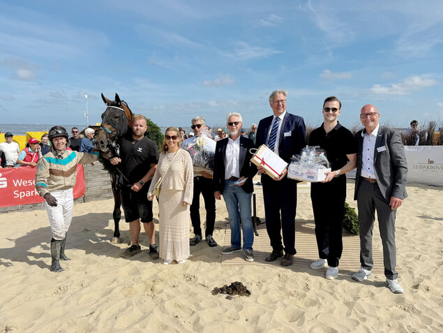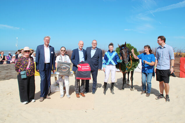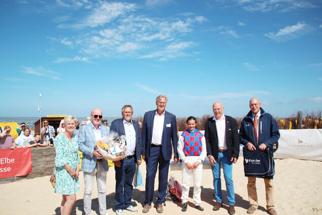 6. Rennen - Galopper, Distanz 1.900 Meter (Ehrenpreis und 5.000 Euro); Preis der Kaesler Nutrition und SOWADE GmbH (Hans-Heinrich-Isenbart-Gedächtnisrennen - Preis des Nordseebads Otterndorf) (v.l.n.r.): Diana und Heiko Sowade, Claus Johannßen, Präsident Jos van der Meer, Siegerin Anna von den Troost, Besitzer Christian Freiherr von der Recke, Thomas Harting (Kaesler Nutrition GmbH). Foto: Wattrennverein