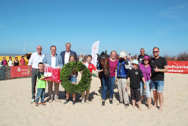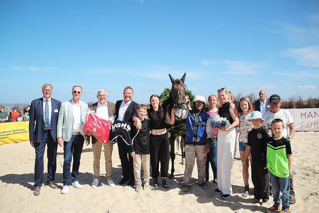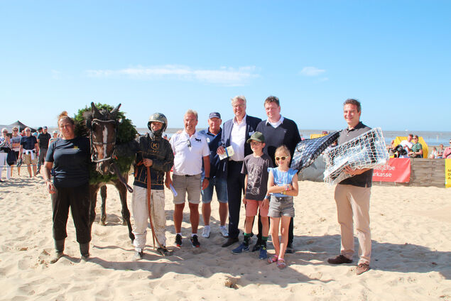 5. Rennen - Traber, Distanz 1900 Meter (Ehrenpreis und 2.600 Euro), Preis der Stadtsparkasse Cuxhaven, VGH-Versicherungen (Klaus-Kamp-Gedächtnisrennen - Preis von Duhnen), Ehrenpreis vom Strandhotel Kamp (v.l.n.r.): Präsident Jos van der Meer, Christian Kamp (Strandhotel Duhnen), Axel Lohmeier (Stadtsparkasse Cuxhaven), Oliver Bode (VGH-Versicherungen), Lonis und Leonie Skoruppa, Sieger Bernd Schrödl, Annette Kamp und weitere Familienmitglieder der Familie Skoruppa. Foto: Wattrennverein