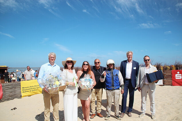 8. Rennen - Galopper, Distanz 2.500 Meter (Ehrenpreis und 6.000 Euro); Preis des Landkreises Cuxhaven mit freundlicher Unterstützung der Weser-Elbe-Sparkasse, Sonderehrenpreis der Künstlerin Anke Dinkelbach (Henry-Böhack-Gedächtnisrennen) (v.l.n.r.): Eva Viehoff (MdL), Präsident Jos van der Meer, Anke Dinkelbach, Rolf Sünderbruch (Vorstand Weser-Elbe Sparkasse), Landrat Thorsten Krüger, Siegerin Aline Schubert, Manuela Schubert und Alexander Finis. Foto: Wattrennverein