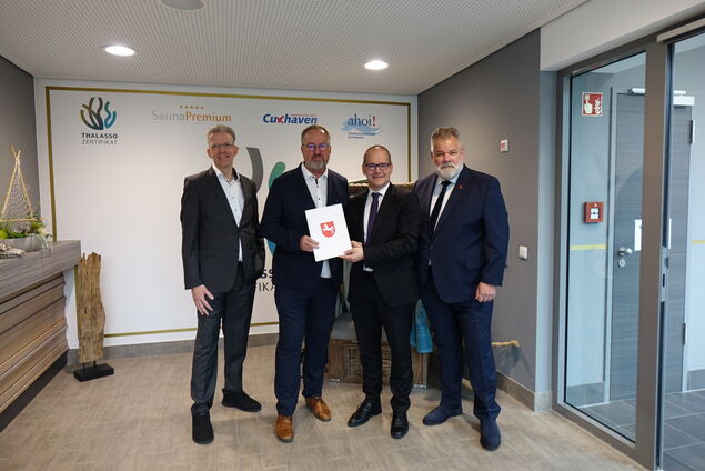 Mit der neuen Prädikatisierung würdigt das Land Niedersachsen die herausragende Gesundheitskompetenz und die kontinuierliche Entwicklung Cuxhavens im Bereich Thalasso, Prävention und Kurwesen. Niedersachsens Wirtschaftsminister Grant Hendrik Tonne überreichte im Thalassozentrum "Ahoi" in Duhnen die Urkunde an Oberbürgermeister Uwe Santjer, Kurdirektor Olaf Raffel und Badleiter Sascha Bange.