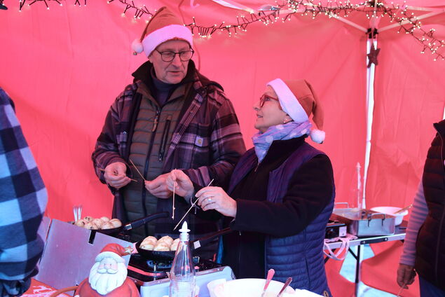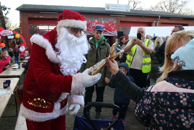 Wer es - passend zum 1. Advent - ruhiger angehen lassen wollte, der stöberte zeitgleich vielleicht an den in der Fahrzeughalle aufgebauten Ständen: Zur Jahreszeit passende Dekoration für Haus und Garten fand sich dort ebenso wie Handgemachtes, das sich als Weihnachts- oder als Nikolausgeschenk eignete. Anlaufpunkt Nummer eins blieb für viele Besucher des Traditionsmarktes aber die Punschbude. Oder auch einer von mehreren Verköstigungsständen. "Wir freuen uns, dass wir unter anderem unsere Theix-Gruppe hier auf dem Markt begrüßen können", warf Ortsbürgermeisterin Claudia Bönnen ein. Der Duft frischer Crêpes wehte über den Platz - mutmaßlich gebacken nach einem Originalrezept aus Sahlenburgs französischer Partnergemeinde. Für die Zusammenstellung des Angebots auf dem diesjährigen Nikolausmarkt zeichnete das Nikolausmarkt-Komitee unter Leitung von Jesse König verantwortlich. Die Organisation betreffend habe man beizeiten dafür Sorge getragen, "den Staffelstab weiterzugeben", verriet Bönnen.