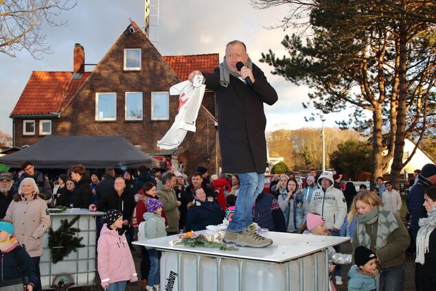 Baumschmuck und Wollsocken konnte man zwischen Feuerwehrhaus und Kita erstehen. Mit ein wenig Bieterglück und dem nötigen Kleingeld ließen sich auf dem diesjährigen Nikolausmarkt aber noch ganz andere "Mitbringsel" abstauben. Ab 14 Uhr kamen am Sonntag (30. November 2025) zwei Dutzend streng limitierte Sahlenburg-Fahnen unter den Hammer.