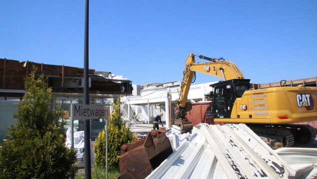 Der Longfront-Bagger beißt sich in die Dachkonstruktion, rüttelt ein wenig an der metallenen Einfassung und binnen Sekunden hat er ein großes Stück der Dachfassade des alten Autohauses zu fassen bekommen. Das flinke Fahrzeug wendet sich und entsorgt die Metallteile kurz darauf in einen extra dafür vorgesehenen Container. Die Arbeiten auf dem Gelände an der Grodener Chaussee gehen in diesen Tagen unvermindert weiter. Schon Ende Mai, spätestens in der ersten Juni-Woche, soll von dem einstigen "Autohaus Nord" nichts mehr zu sehen sein.