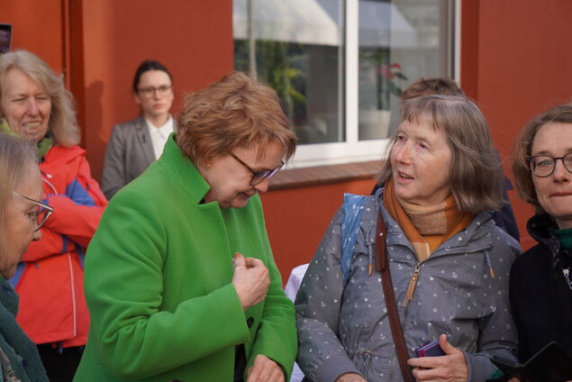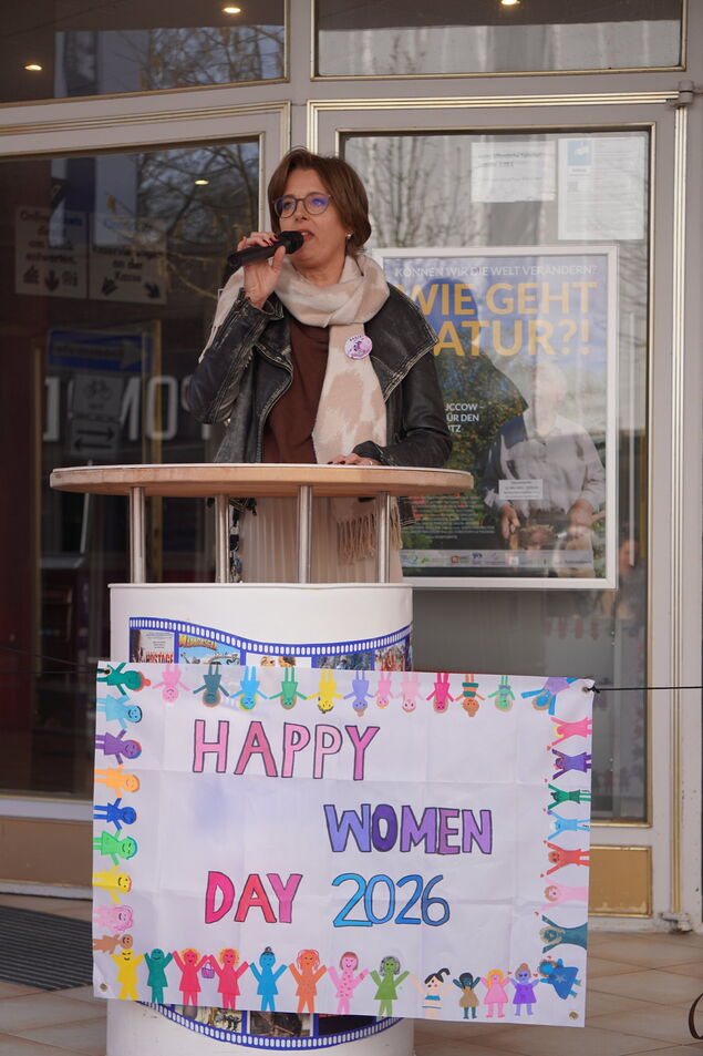 Die Gleichstellungsbeauftragte des Landkreises, Kirsten von der Lieth, eröffnet die Aktion. Anschließend spricht die niedersächsische Innenministerin Daniela Behrens, von den Stufen vor dem Bali-Kino aus. "Wenn wir uns die Fortschritte der Gleichberechtigung ansehen, merken wir: Der Fortschritt ist eine Schnecke. Frauen verdienen immer noch weniger als Männer, sie bekommen weniger Rente, übernehmen deutlich mehr Care-Arbeit - für Familien, Angehörige, aber auch im beruflichen Bereich. Wir haben das FIPO-Gap - Frauen in Führungspositionen in Wirtschaft, Verwaltung, Wissenschaft oder Journalismus sind immer noch unterrepräsentiert. Und trotz gesetzlicher Vorgaben steigen diese Zahlen nur unwesentlich."