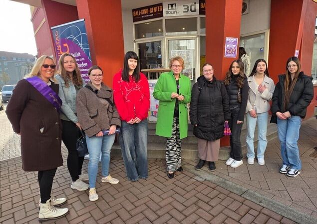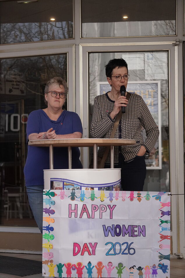 Auf den Stufen vor dem Kino herrscht lebhafte Stimmung: Plakate und Flaggen, die "Omas gegen Rechts" erinnern daran, dass Demokratie und Frauenrechte zusammengehören - und aktuell verteidigt werden müssen. Schulsozialarbeiterin Katrin Stehno von der Osteschule in Hemmoor hat mit Schülerinnen einen Banner und kleine Flaggen vorbereitet. Heute geht es um Sichtbarkeit, Engagement - und darum, dass Gleichberechtigung hart erkämpft werden muss.