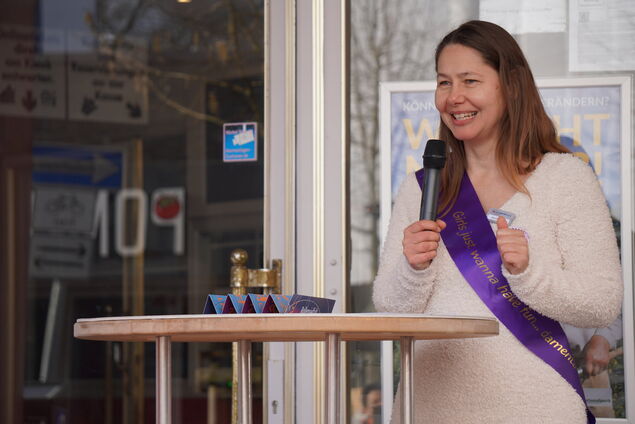 Mariana Härtel von der Beratungs- und Interventionsstelle häusliche Gewalt übernimmt anschließend das Mikrofon. "Frauen sollen Superheldin, Timer-App und Hochglanzmagazin in einem sein", sagt sie und erntet zustimmendes Lachen. Sie betont, dass Scheitern nicht persönliches Versagen ist. Unsichtbare Arbeit, Care-Arbeit, Bildungslücken - all das tragen noch immer die Frauen.