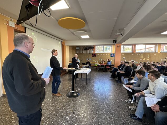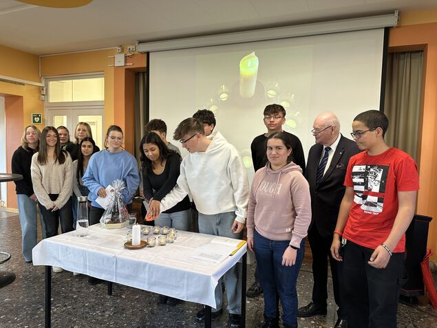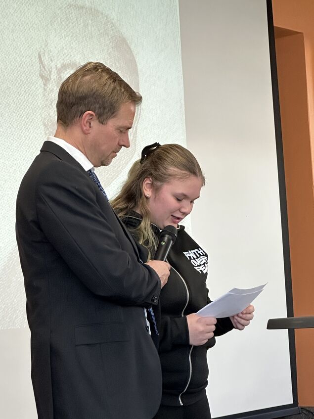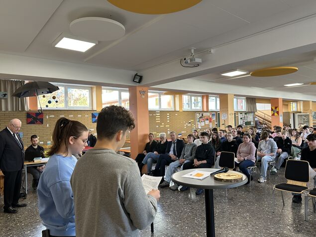 Arne Ohland-Schumacher appellierte mit eindringlichen Worten an die Jugendlichen, ihrer Verantwortung für den Schutz der Demokratie und gegen Hass und Diskriminierung nachzukommen. Auch Schülerinnen und Schüler seiner Schule seien dem Krieg nur durch Flucht entkommen. "Es geht einem sehr nahe, wenn man hört, dass hier Kinder sind, deren Geschwister in Schlauchbooten ums Leben gekommen sind."