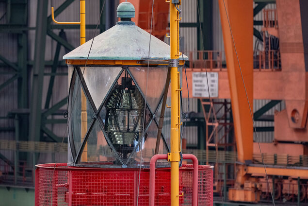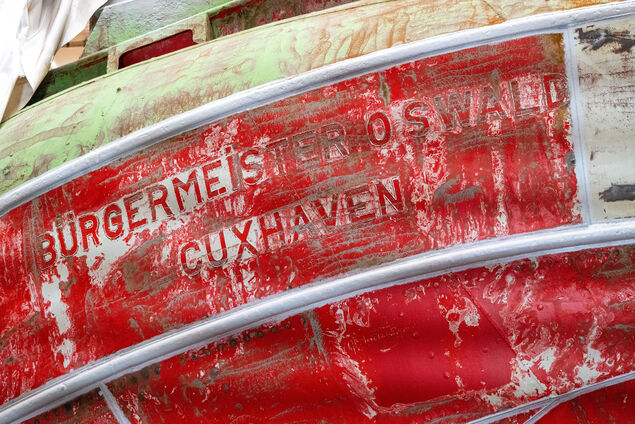 Die ehemalige Position "Elbe 1" ist trotz des teils entfernten roten Anstrichs auch in der großen Schiffbauhalle in Stralsund als Schriftzug zu erkennen, ebenso der eigentliche Schiffsname "Bürgermeister O'Swald". "Aber "Bürgermeister O'Swald" kennt keiner", sagte Walther. Das sei der Name eines ehemaligen Hamburger Bürgermeisters. Wenn das Schiff fertig ist, werde es wieder im altbekannten Rot leuchten mit weißer Schrift.