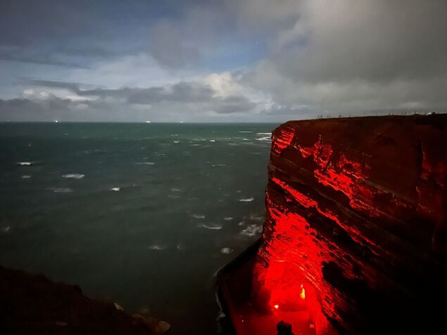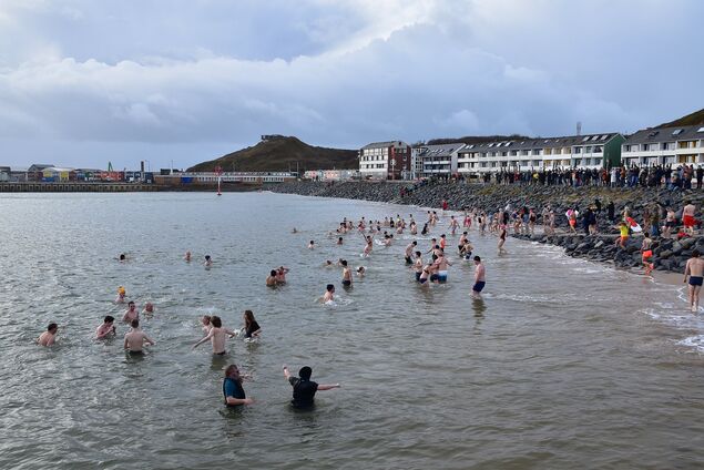 Das miese Wetter hielt am 1. Januar 2026 zahleiche Insulaner und Gäste nicht davon ab, zur Mittagsstunde am Neujahrsanbaden teilzunehmen und sich am Südstrand auf der Insel in die kalten Fluten der Nordsee zu stürzen. Zahlreiche Interessierte zog es zum Strand an der Landungsbrücke, die das Spektakel als Zuschauer verfolgten. Der Silvesterabend war zuvor trotz des Wetters nach Plan verlaufen. So zog das Klippenleuchten am Mittwochabend alle Blicke auf sich, bevor kurz nach Mitternacht das große Höhenfeuerwerk zum Jahreswechsel den Himmel bunt malte. "Das Feuerwerk war klasse. Die Zuschauer wirkten während des Feuerwerks andächtig aber an Ende war lautes Jubeln überall auf der Insel zu hören", beschreibt Tourismusexperte Dr. Martin Linne die Stimmung. Gut besucht sei im Anschluss die Party in der Nordseehalle gewesen. Linne und seine Frau machen bis Sonntag Urlaub auf Helgoland, sodass das Wetter ihre Pläne nicht durcheinander wirbelt. Aber auch andere Gäste sind offensichtlich entspannt: "Ich habe von keinen Problemen gehört. Viele gucken sich hier das Spektakel an."