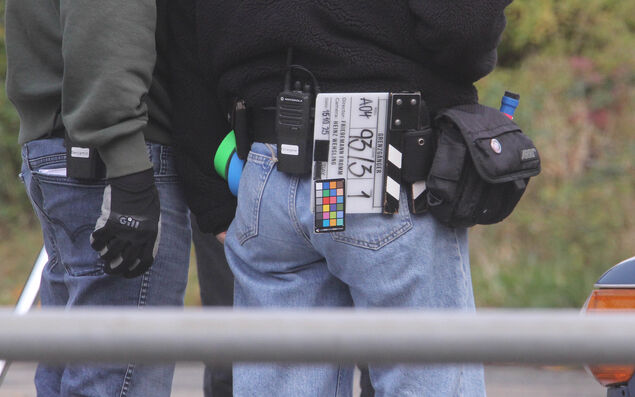 Regie, Kameramann und -assistent schauen sich die Aufnahmen auf kleinen Monitoren an. Nachdem die Szene im Kasten ist, rollt das übrige Filmteam mit mehreren Bollerwagen an. Gut 20 Mitarbeiter sind am Set, das nun direkt am Eingang der Rundturnhalle aufgebaut ist.
