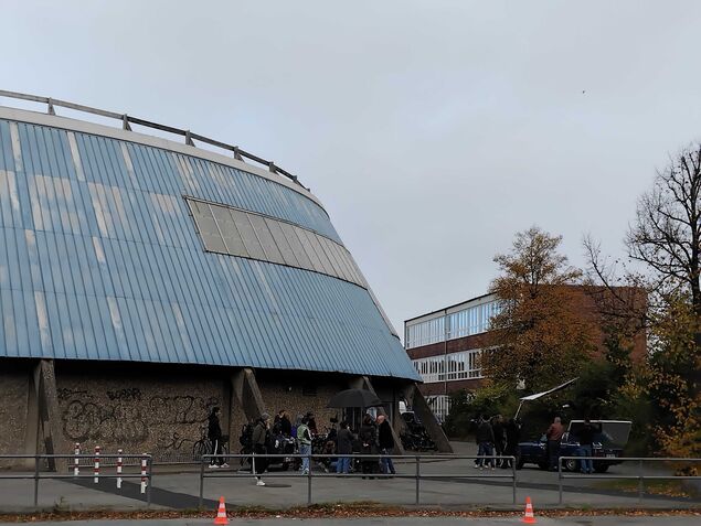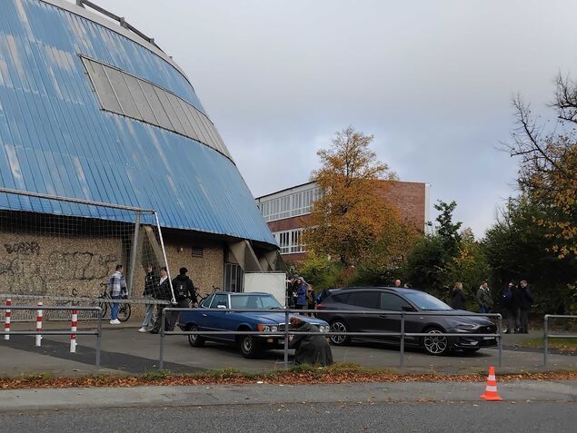 Lediglich große Technik-Lkw parken an diesem Drehtag direkt an der Schulstraße. Dann geht es auch schon mit einer Drohnenaufnahme los: Gefilmt wird die Ankunft eines blauen Oldtimers, der direkt vor der Rundturnhalle parkt.