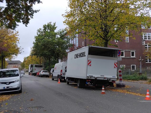 Um möglichst wenig Aufsehen zu erzeugen, hat das TV-Team seinen umfangreichen Fuhrpark im hinteren Teil des Schulhofs an der Realschule Cuxhaven aufgebaut: Aufenthalts-, Masken- und Kostümfahrzeuge, Catering- und Toilettenwagen. Dank der Herbstferien bietet sich der versteckte Platz offenbar an.