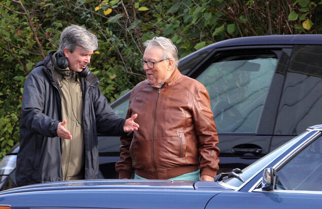 Hansjürgen Hürrig und Jan Josef Liefers steigen in einer weiteren gedrehten Szene aus dem Oldtimer, unterhalten sich und gehen ins Gebäude.