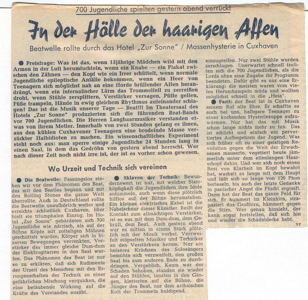 Und die Presse? Die Cuxhavener Medienvertreter sind entsetzt. Mit Musik habe diese Veranstaltung nichts mehr zu tun, tippt der Reporter der "Cuxhavener Presse" am nächsten Tag in seine mechanische Schreibmaschine: "Das ist schlicht und einfach ein pervertiertes Aufbegehren der Jugend." Unter der Überschrift "In der Hölle der haarigen Affen" spuckt das Blatt Gift und Galle. Der Beat habe es geschafft, "halbgare Teenager zu einer kochenden Hysteriesuppe aufzuwärmen". Von "infernalischem Lärm" ist in dem "Presse"-Artikel die Rede, von "verzückten Halbidioten" und "epileptischen Anfällen". Das Beweismaterial schiebt die "Presse" gleich hinterher: Zwei Stühle seien zu Bruch gegangen.