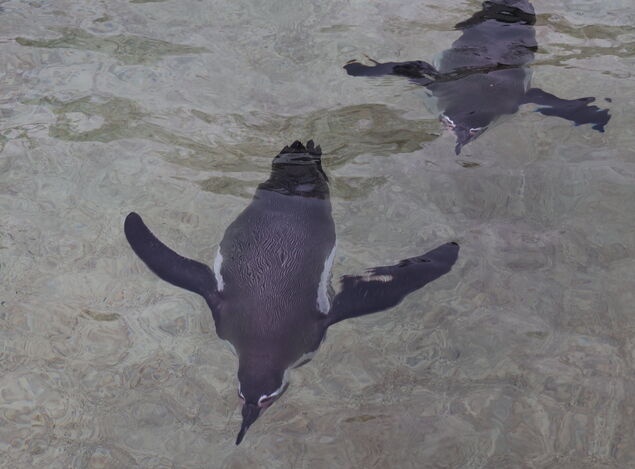 Beobachtet man die Pinguine länger, erkennt man schnell ihre Rituale. Zum Dösen stehen sie oft einfach da, halb wach, halb weggetreten. Im Tiefschlaf kippen sie nach vorn und liegen auf dem Bauch, als hätten sie mitten im Schritt die Pausentaste gedrückt. Und manche schaukeln sogar schlafend auf dem Wasser, als hätten sie sich ein eigenes kleines Boot gemietet. Am wohlsten und sichersten fühlen sie sich ohnehin im Wasser - dort jagen, flitzen und spielen sie mit großer Freude. Im besten Fall, wenn es das Wetter zulässt, das ganze Jahr über. Erst wenn das Becken im tiefsten Winter zufriert, ziehen sie ins Innengehege um. Bis dahin trotzen sie Wind und Wetter mit Gelassenheit.