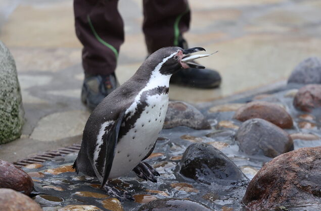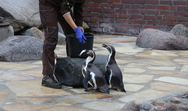 Wer regelmäßig im Kurpark unterwegs ist und die Humboldt-Pinguine besucht, dem ist eine Sache bestimmt schon aufgefallen. Denn einmal im Jahr verändert sich das Bild im Gehege drastisch: die Mauser. Drei Wochen lang bleiben die Tiere dann an Land, weil sie ihr gesamtes Gefieder austauschen. Sie wirken in dieser Zeit etwas pummelig, weil sie vorher ordentlich gefuttert haben - schließlich leben sie in der mausernden Phase von ihren Reserven. Im Alltag dagegen stehen zwei Mahlzeiten auf dem Programm, und bis zu 14 Fische pro Tag verschwinden in ihren Schnäbeln. Je nach Wetter, Laune und Lebensphase mal mehr, mal weniger.