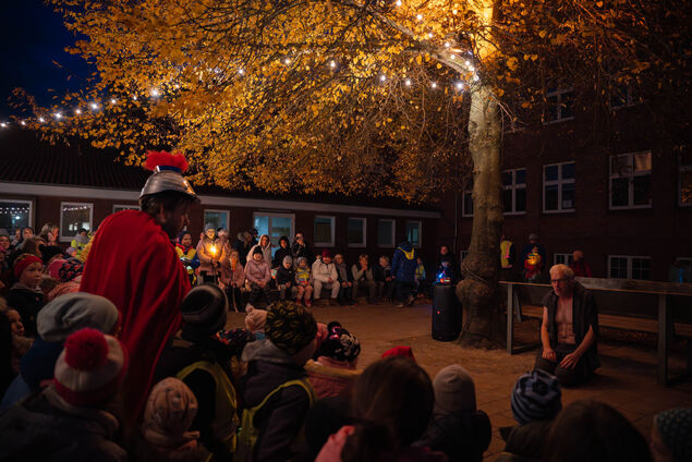 Zurück auf dem Schulhof fand zunächst ein Anspiel der Martinsgeschichte statt. Zwischen den Textpassagen und dem darstellenden Spiel sangen die Kinder lautstark die zuvor einstudierten Lieder.
