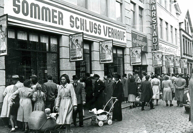 Die Kundschaft bewegte sich weitgehend auf den Bürgersteigen. Nur wenn Karstadt (bis 1960 noch inmitten der Einkaufstraße) zum Sommerschlussverkauf öffnete, drängelte sich die preisbewusste Kundschaft vor den Eingangstüren und brachte den Verkehr zum Stoppen.